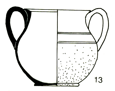 base élargie, assise concave ; anse s'attachant sur le haut du col et sur le milieu de la panse ;