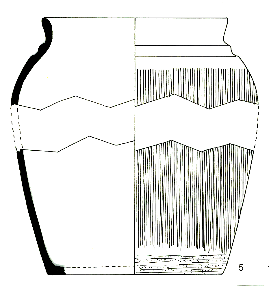 surface brute. Six lignes polies réparties du milieu de la panse jusqu'au milieu du col et zone horizontale