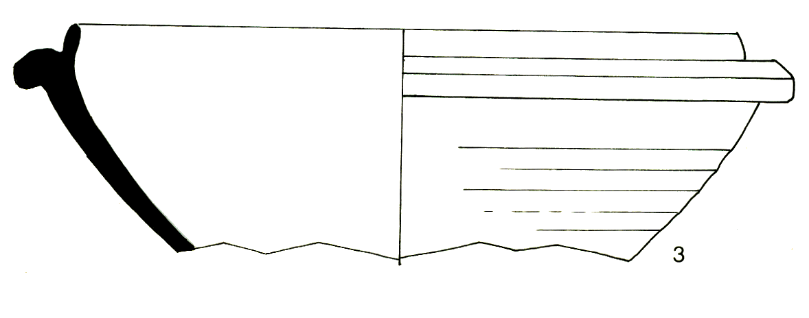 bord triangulaire, lèvre ronde céramique tournée, grise en surface et noire sur les cassures ;