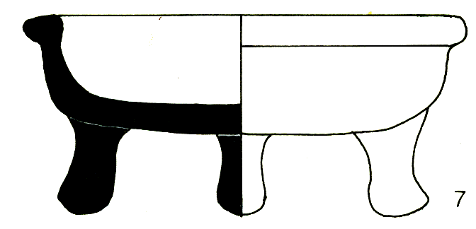 rebord en méplat débordant, lèvre convexe ; pieds coniques évasés ;