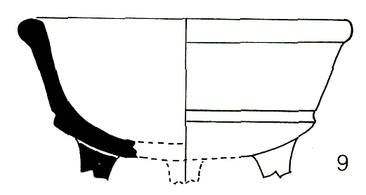 rebord en rouleau, lèvre ronde ; pieds coniques évasés ;
