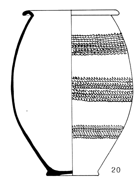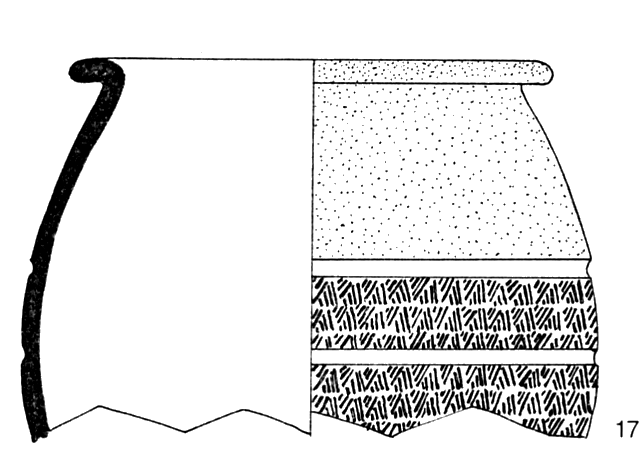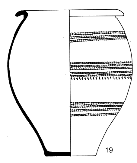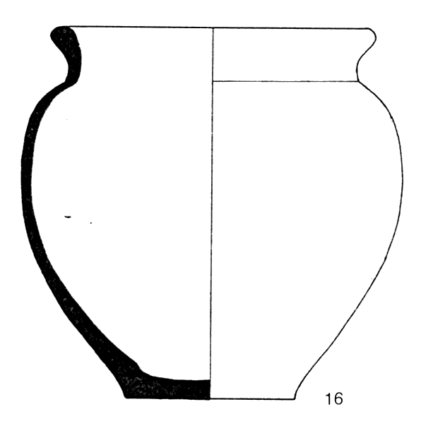 Pot de forme ovoide ; encolure évasée, concave, rebord épaissi à l'extérieur, lèvre convexe ;