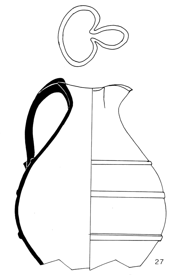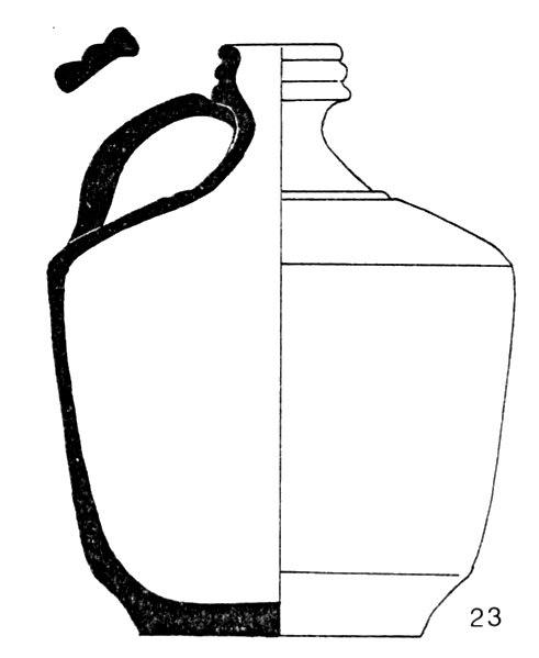 base cylindrique, assise concave ; anse s'attachant sur le haut du col et sur le haut de la panse ;