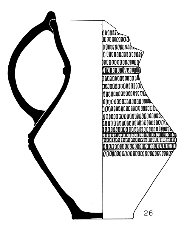 Le col, le haut et le milieu de la panse, sont ornés de lignes de petits rectangles imprimés à la molette.