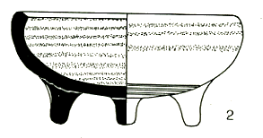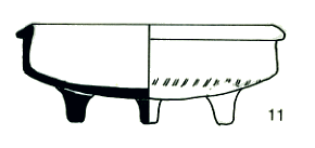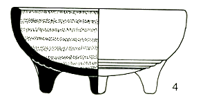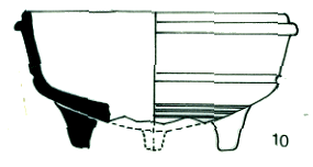 Marmite tripode de forme hémisphérique ; lèvre convexe ; pieds coniques évasés ; céramique tournée, couleur grise en surface et sur les cassures ; inclusions moyennes: quartz irrégulier en proportion moyenne, mica ; surface brute. Lignes horizontales polies sur toute la surface interne et sur la partie supérieure externe de la panse ; sillons horizontaux au niveau de l'attache des pieds.