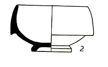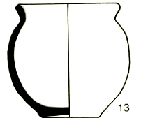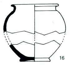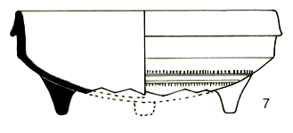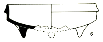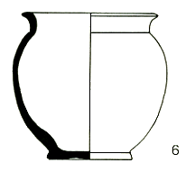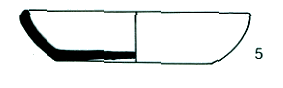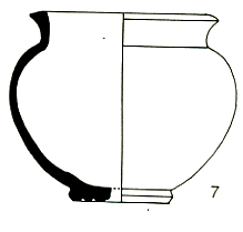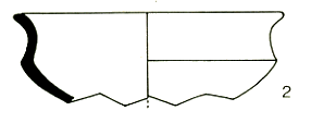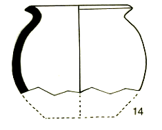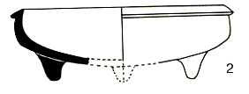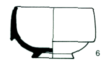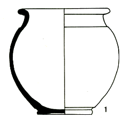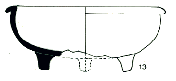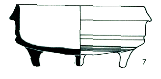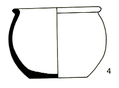 Partie supérieure d'une marmite tripode de forme hémisphérique ; rebord en rouleau, lèvre ronde ; céramique tournée, pâte de couleur noire, orangée en surface ; inclusions moyennes : quartz irrégulier en proportion moyenne, mica. Carène soulignée par un sillon, d'autres se trouvent au niveau de l'attache des pieds.