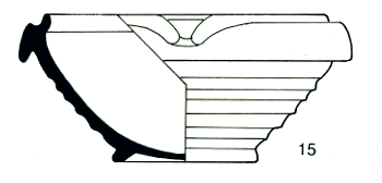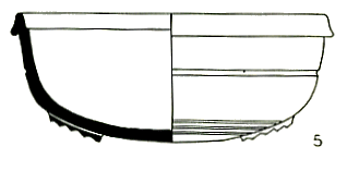 Bol aux parois divergentes rectilignes en bas, puis divergentes rectilignes ; rebord en méplat débordant, lèvre convexe ; base étirée, assise plane ; céramique tournée, pâte de couleur noire, orangée en surface ; inclusions très grossieres: quartz irrégulier en proportion moyenne, mica ; surface lissée. Un sillon souligne la carène.