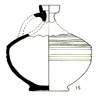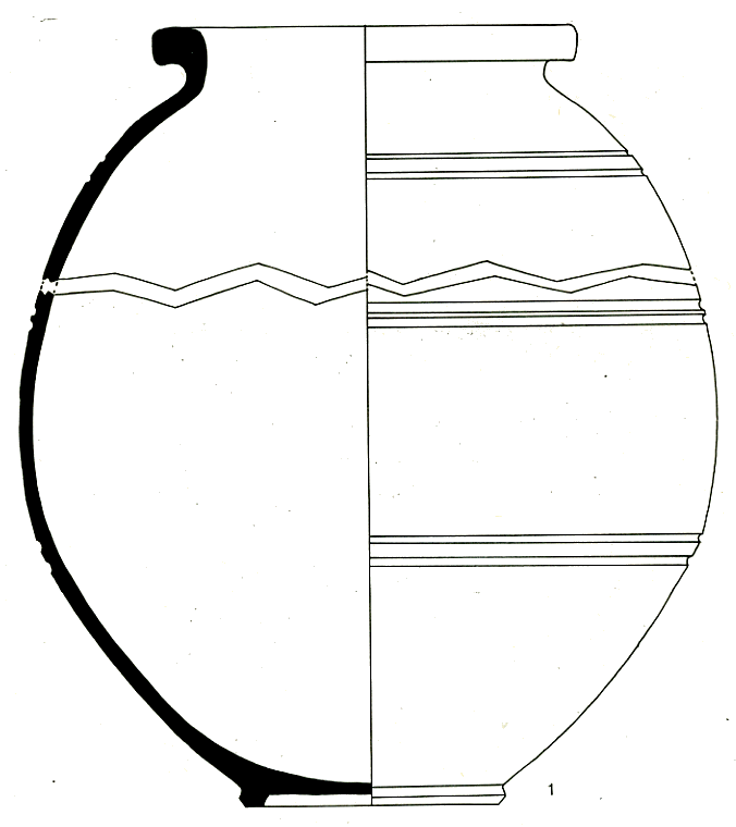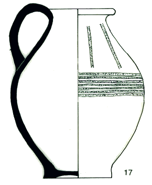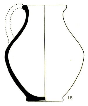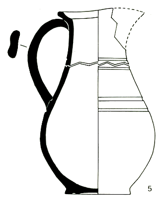 Pichet de forme ovoide ; encolure rentrante, concave, rebord en rouleau, lèvre ronde ; base étirée, assise concave ; anse s'attachant sur la lèvre et sur le haut de la panse ; céramique tournée, couleur gris-bleu en surface et sur les cassures ; inclusions grossieres: quartz irrégulier en proportion moyenne, mica ; surface brute. Groupe de lignes horizontales polies sur la moitié inférieure du haut de la panse et lignes verticales polies sur le col.