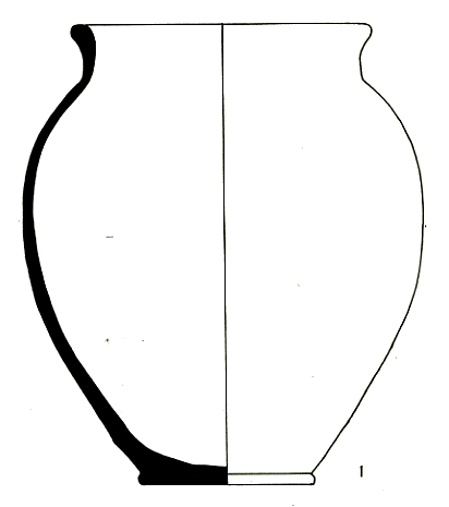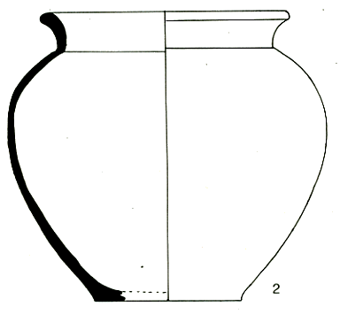 Pot de forme ovoide ; encolure évasée, concave, rebord épaissi à l'extérieur, lèvre ronde ; base étirée, assise plane ; céramique tournée, couleur gris-bleu en surface et sur les cassures ; inclusions grossieres: quartz irrégulier en proportion moyenne, mica ; surface brute.