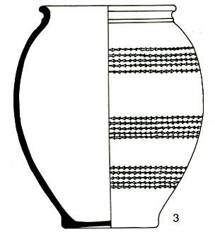 Pot de forme ovoide ; encolure verticale, concave, lèvre ronde ; base étirée, assise concave ; céramique tournée, couleur orangée en surface et sur les cassures ; inclusions fines: quartz, mica ; surface avec couverte. Trois zones guillochées réparties sur la hauteur de la panse.