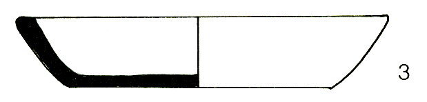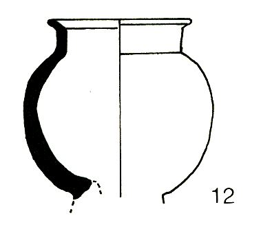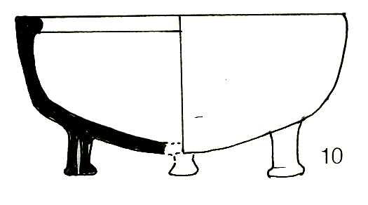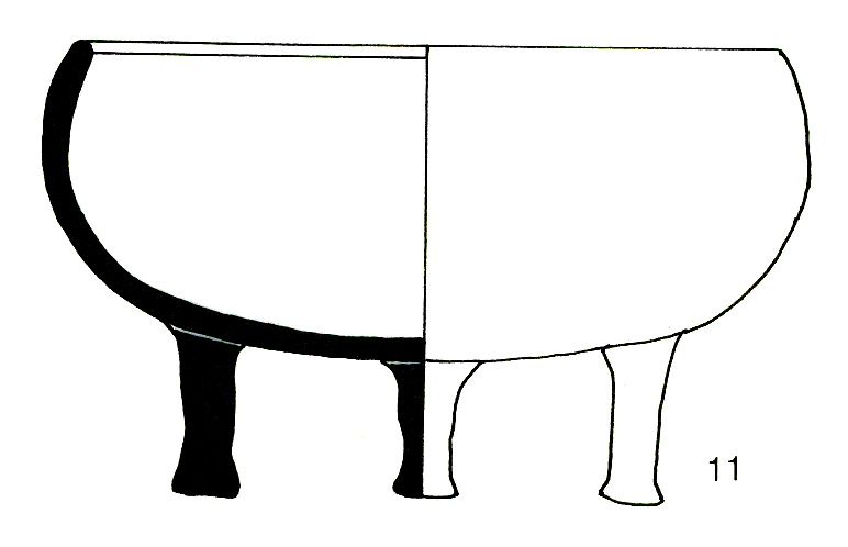 Marmite tripode de forme elliptique applatie ; lèvre ronde ; pieds en tétine verticaux ; céramique tournée, couleur grise en surface et sur les cassures ; inclusions moyennes: quartz ; surface brute.