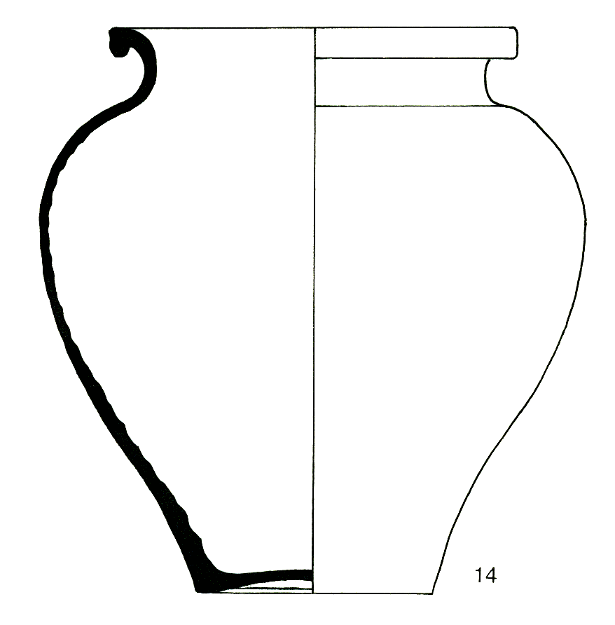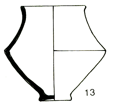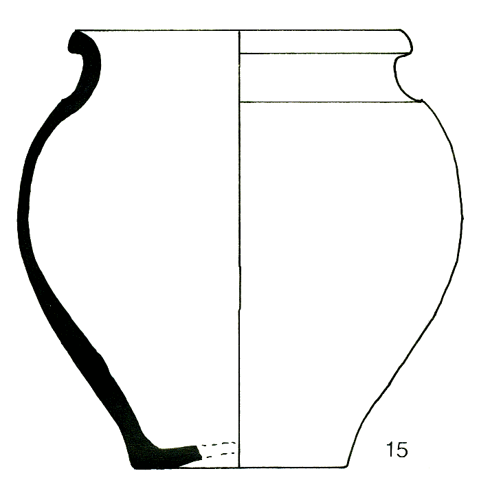 Pot aux parois divergentes rectilignes ; encolure rentrante, concave, lèvre ronde ; base élargie, assise concave ; céramique tournée de couleur noire en surface ; inclusions fines ; surface polie.