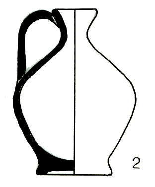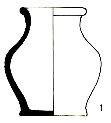 Flacon de forme ovoide ; encolure verticale, concave, lèvre ronde ; base annulaire ; anse s'attachant sur le haut du col et sur le milieu de la panse ;