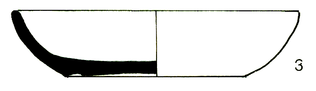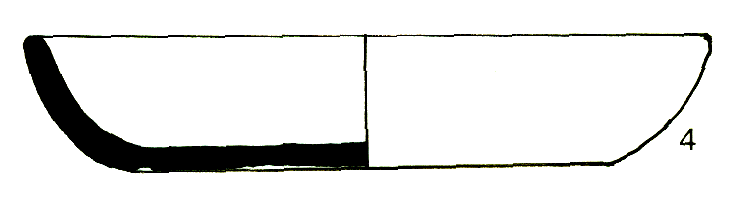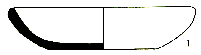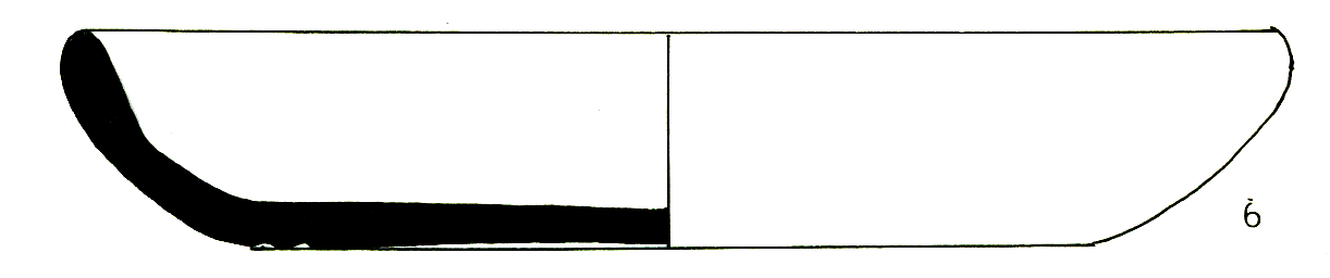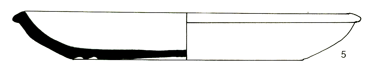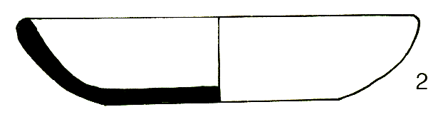 Plat aux parois divergentes convexes ; lèvre en biseau ; base portante, assise concave ; céramique tournée, couleur grise en surface et sur les cassures ; inclusions grossières : quartz abondant ; surface brute.