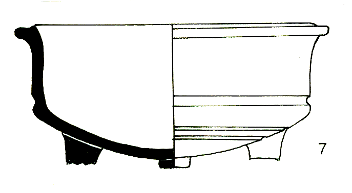 Marmite tripode aux parois divergentes convexes en bas, puis verticales rectilignes ; rebord en méplat débordant, lèvre convexe ; pieds coniques verticaux ; céramique tournée, pâte de couleur noire, orangée en surface ; inclusions grossières : quartz ; surface brute. Un sillon à la limite des deux parties de la panse et deux autres au niveau de l'attache des pieds.