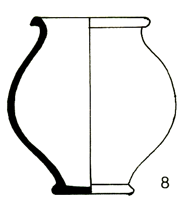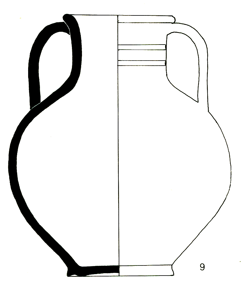 Pichet de forme sphérique ; encolure verticale, rectiligne, rebord incliné vers l'extérieur, lèvre ronde ; base élargie, assise tournée ; anse s'attachant sur le haut du col et sur le haut de la panse ; céramique tournée, couleur rouge brique en surface et sur les cassures ; inclusions grossières: quartz ; surface brute. Deux légers sillons sur le milieu du col.