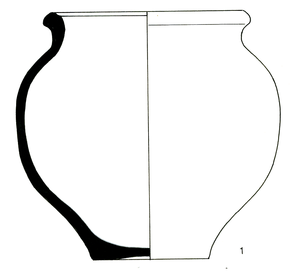 Pot de forme sphérique ; encolure verticale, concave, rebord épaissi à l'extérieur, lèvre concave ; base étirée, assise concave ;