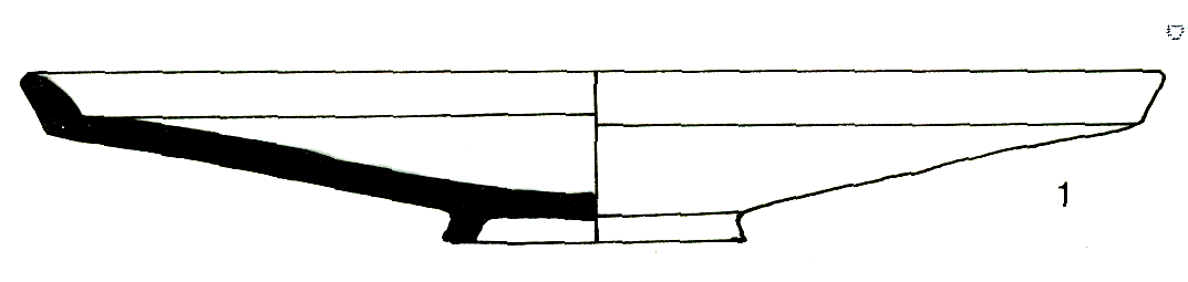 Assiette aux parois divergentes concaves ; rebord en parement, lèvre triangulaire ; base portante, assise plane ; céramique non tournée, couleur noire en surface et sur les cassures ; inclusions moyennes: quartz irrégulier en proportion moyenne ; surface polie.
