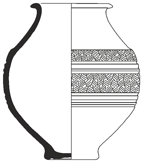 Pot de forme ovoide ; encolure rentrante, concave, rebord incliné vers l'extérieur, lèvre convexe ; base étirée puis élargie, assise tournée ; céramique tournée, pâte de couleur orangée, gris-bleu en surface ; inclusions moyennes : quartz irrégulier en proportion moyenne, mica ; surface polie. Deux zones ornées à la molette et deux groupes de trois sillons en alternance sur la panse.
