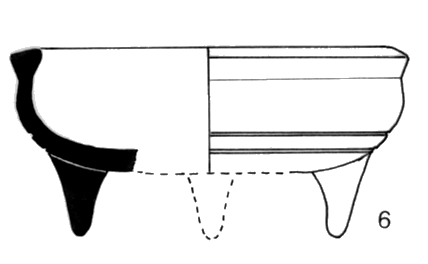 Marmite-tripode de forme hémisphérique ; rebord épaissi à l'intérieur, lèvre plate ; pieds coniques verticaux ;