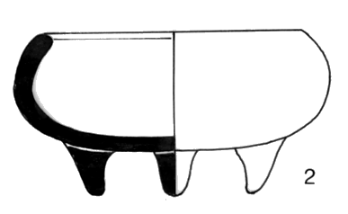 Marmite tripode aux parois divergentes convexes en bas, puis convergentes convexes ; lèvre ronde ; pieds coniques rentrants ; couleur grise en surface et sur les cassures.