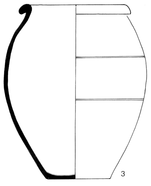 Pot de forme elliptique étirée ; encolure rentrante, rectiligne, rebord épaissi à l'extérieur, lèvre convexe ; base portante, assise plane. Deux sillon de part et d'autre du milieu de la panse.
