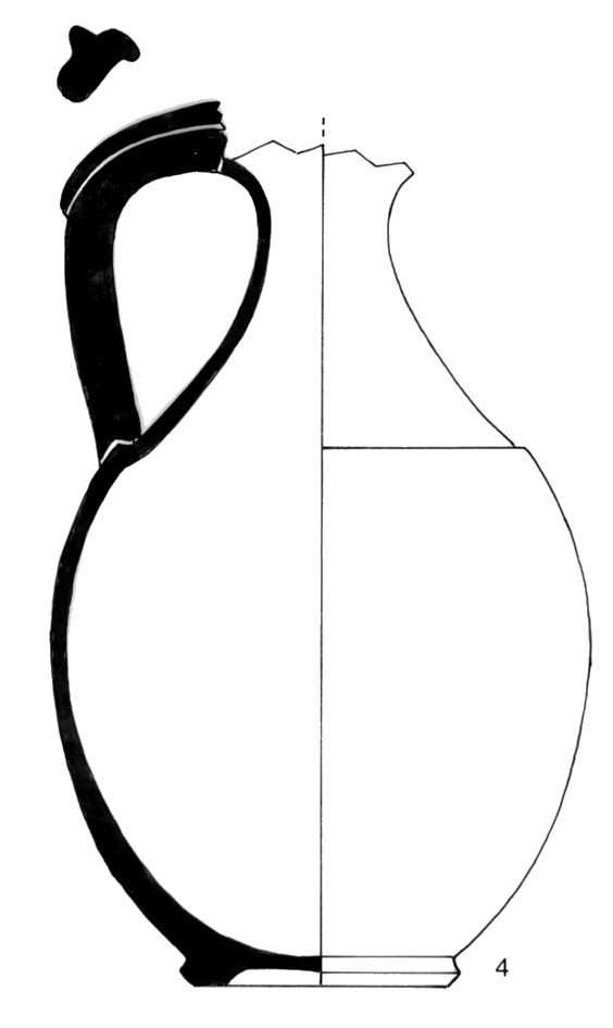 Bouteille de forme elliptique étirée ; encolure rentrante concave, base annulaire, assise concave ; anse s'attachant sur la lèvre et sur le haut de la panse ; céramique tournée, couleur orangée en surface et sur les cassures ; inclusions moyennes : quartz irrégulier en proportion moyenne, mica ; surface avec revêtement micacé.