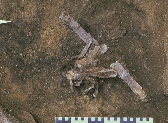 Fosse superficielle avec uniquement du mobilier métallique : Trousseau d'outils miniaturisés, lame de scie, stylet et bague.